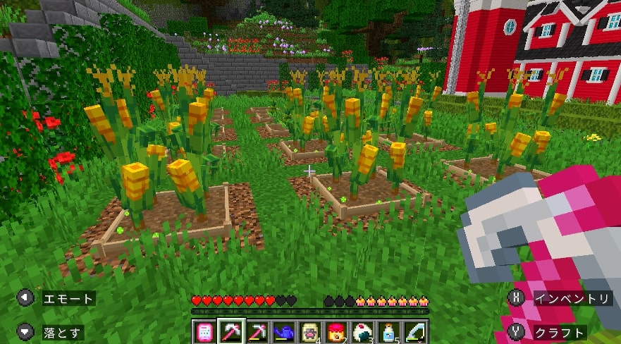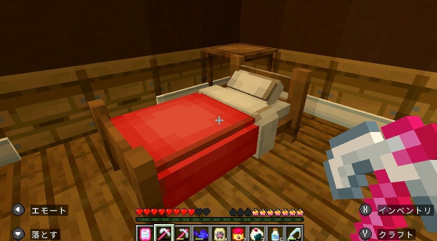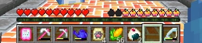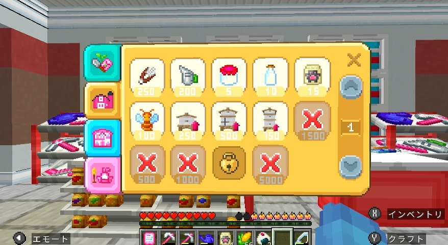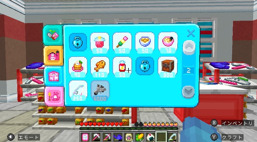 食べ物のゲージが減ったら、料理を食べて回復しましょう。料理は自宅のチェストに少しと、あとはかわいいマーケットで購入できます。