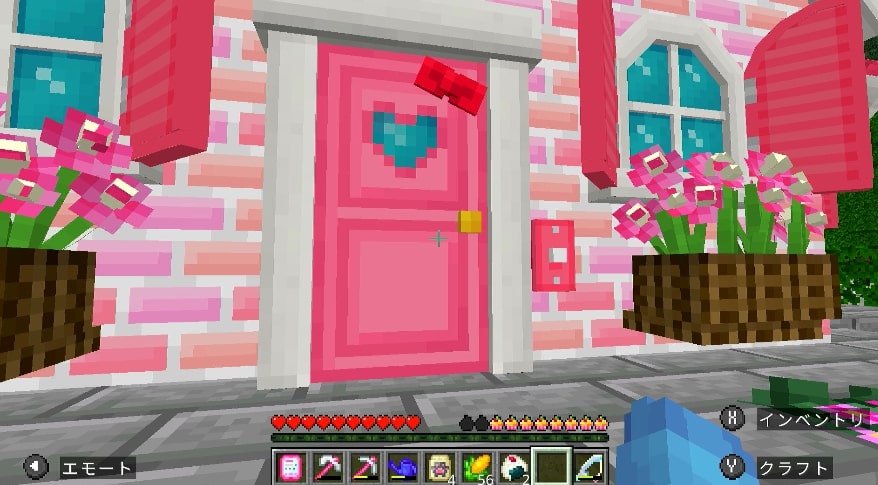 自宅はドアを叩けばは入れますが、キャラクターの家はドア横にあるインターフォンを押すと中へ入れます。上記画像のキティちゃんの家なら白いボタンです。