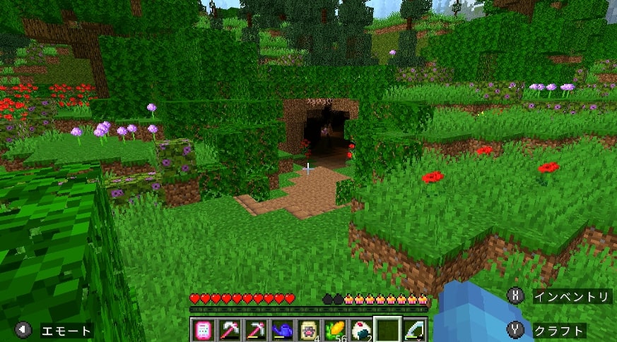 下記画像は、広場から自宅へ帰る道。季節によっては、葉っぱブロックで出入口が隠されていることも。