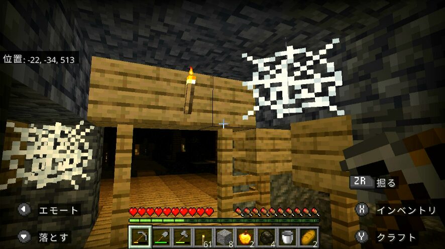 ピースフルでもクモの巣はあり、それを剣で壊すと糸を手に入れることができます。クモの巣は、廃坑で良く見られますが、森の洋館などの構造物の中や稀に木に付いていることもあります。